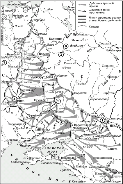 Заполните пропуск в предложении: «Город, обозначенный на схеме цифрой «7», был освобождён от фашистов в тысяча девятьсот ___________г.». Ответ запишите словом (словосочетанием) в именительном падеже.