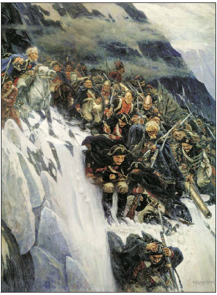Назовите российского военачальника, изображённого на данной картине. Укажите век, когда произошли изображённые на картине события.