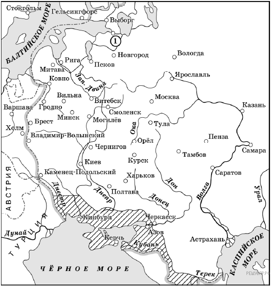 Укажите название города, обозначенного на схеме цифрой «1», в период, когда к России была присоединена заштрихованная на схеме территория.