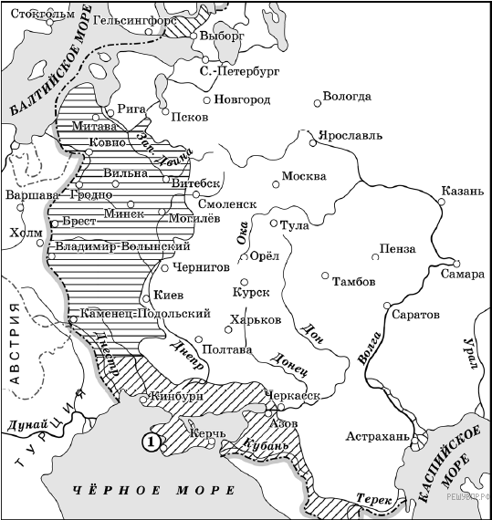 Назовите российского монарха, при котором в состав Российского государства вошла территория, заштрихованная на схеме. В ответе запишите имя и порядковый номер или имя и официальное прозвание монарха. (Например, Петр Первый ИЛИ Петр Великий).