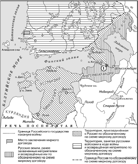 Укажите название города, обозначенного на схеме цифрой «1», в период, когда произошли обозначенные на схеме территориальные изменения.